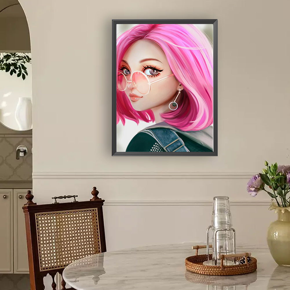 Pink Hair Girl-Full Round Diamond Painting-30x40cm