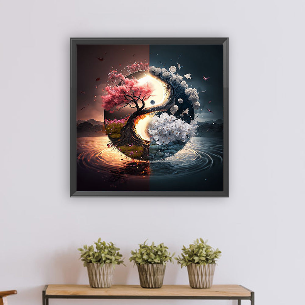 Yin And Yang Diagram Of Sacred Tree-Full Round Diamond Painting-30x30cm